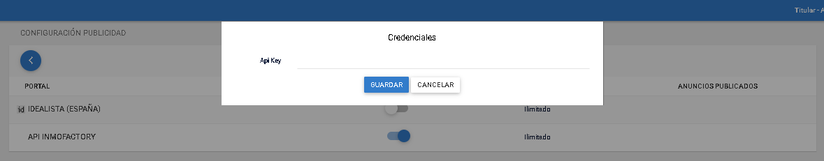 Activar el flag del portal deseado y nos aparecerá el siguiente cuadro, donde rellenar los datos de que debe facilitarte tu comercial de Idealista.